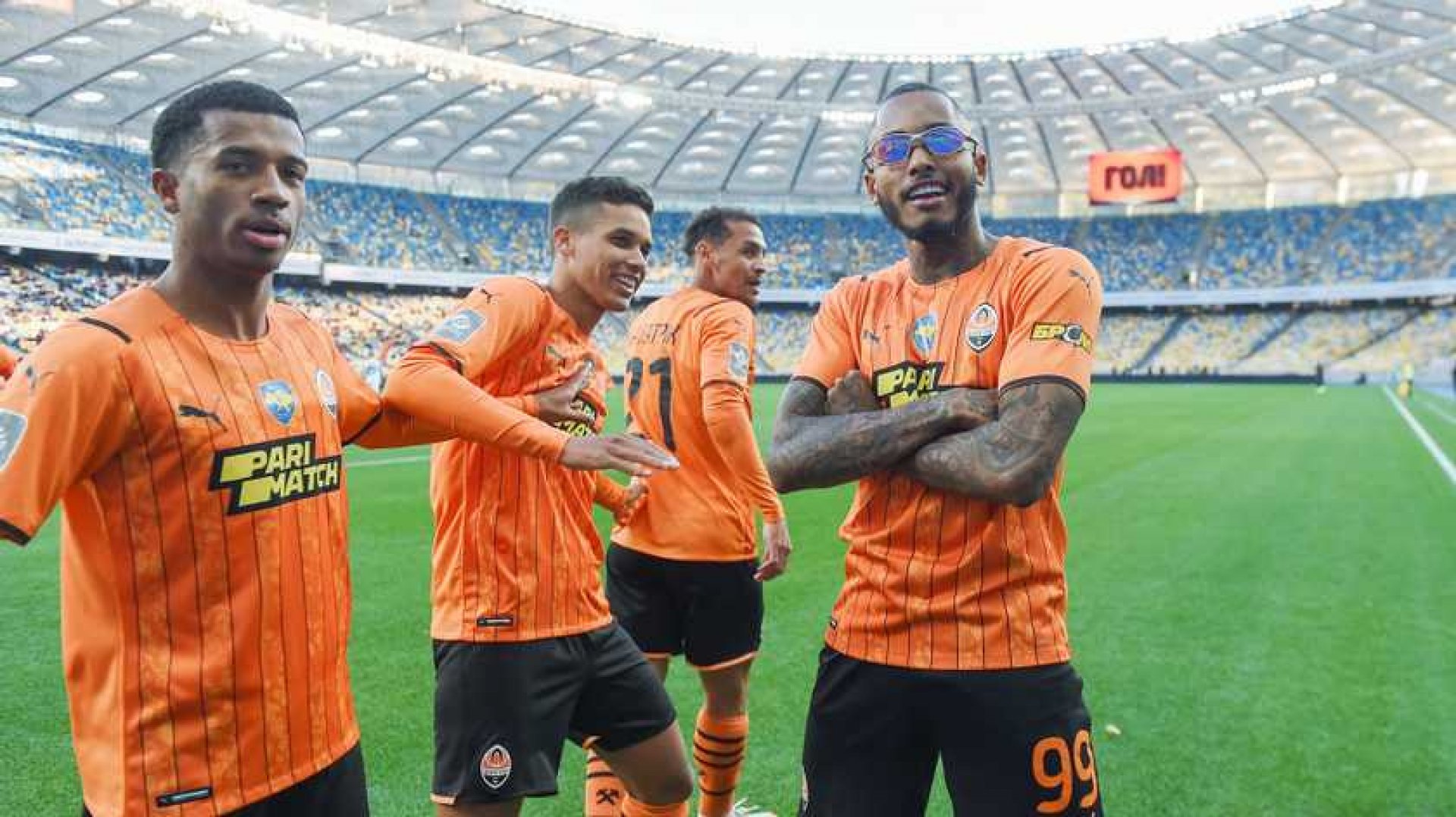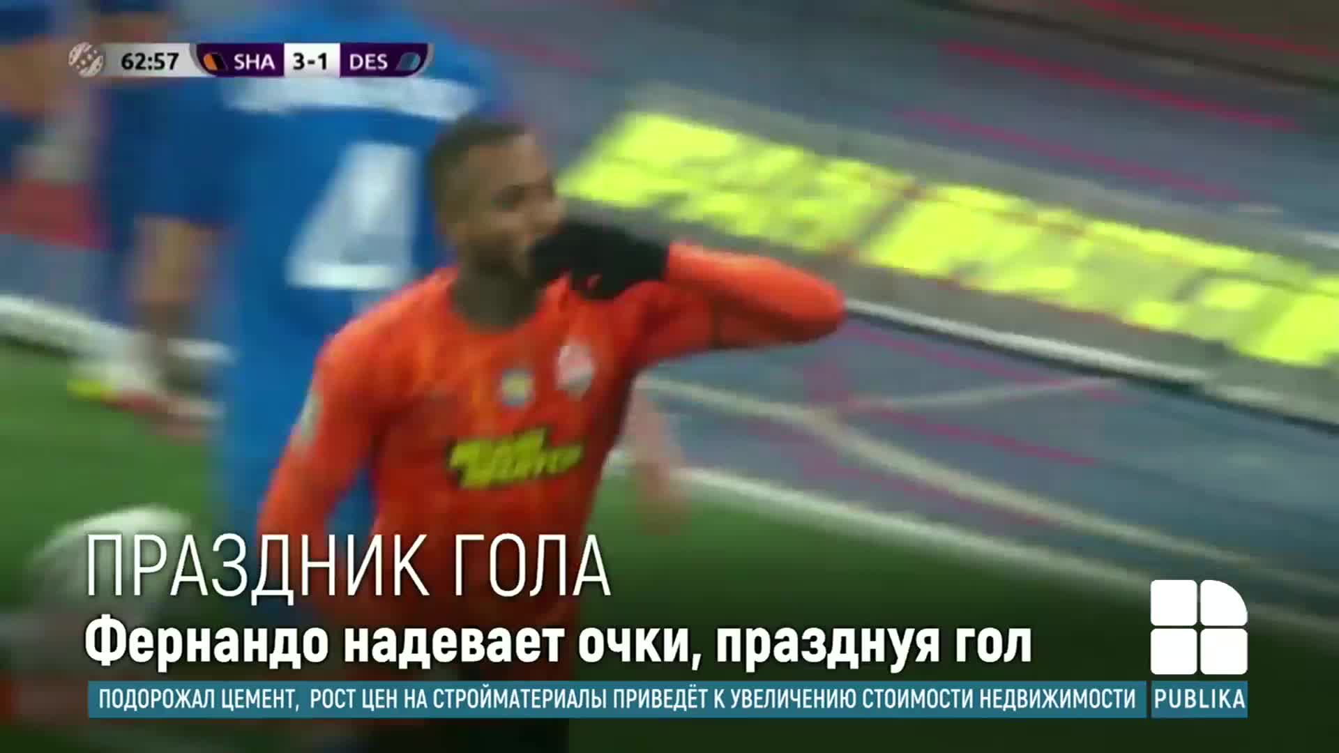 Футболист донецкого "Шахтера" Фернандо надевает очки, празднуя гол