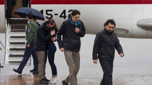 Трое испанских журналистов, которые пробыли в плену в Сирии около 10 месяцев, вернулись на родину. Самолет ВВС Испании, на борту которого находились журналисты Антонио Памплиега, Хосе Мануэль Лопес и Анхель Састр, приземлился утром 8 мая на базе ВВС Торрехон около Мадрида, пишет Meduza.