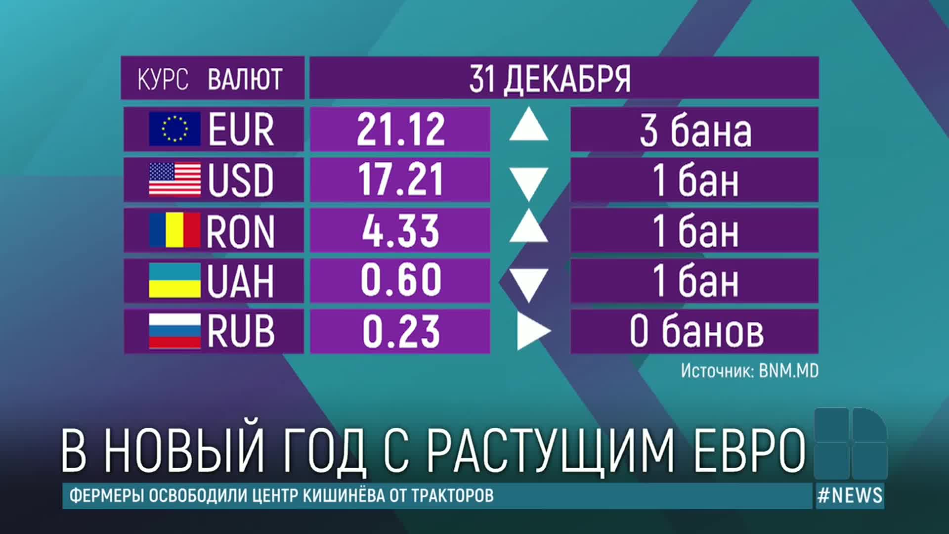 Доллар торгуется по 17,21. Румынский лей приравнивается к четырём молдавским и 33 банам. Цена украинской гривны 60 банов, а российского рубля 23.
