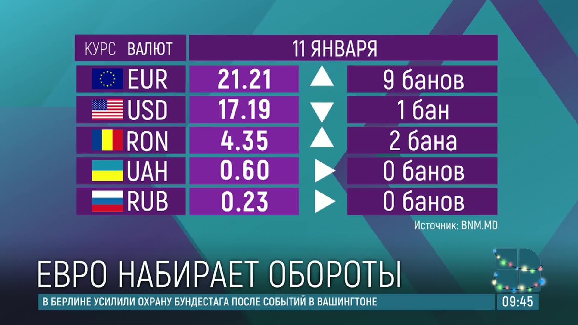 Молдавский лей вновь теряет позиции. По курсу Национального банка, евро вырос в цене на 11 банов и стоит сегодня 21,21. Американский доллар подешевел до 17,19.