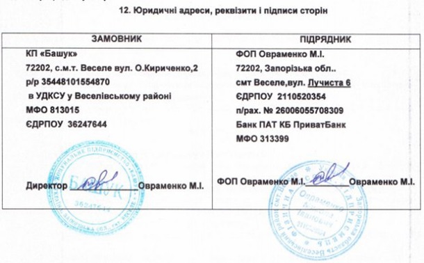 Подрядчиком работ по строительству тротуарных дорожек на одной из улиц поселка выступил предприниматель Овраменко Николай Иванович. Он же занимает должность директора коммунального предприятия, поэтому на договорах по выполнению работ и у заказчика и подрядчика одни и те же подписи.