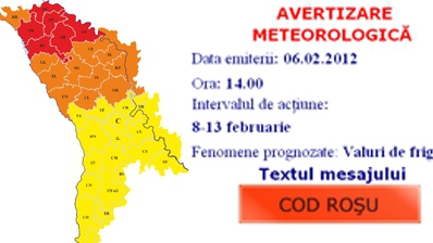 (UPDATE 15.08) Гидрометеослужба объявила в связи с морозами красный код. По информации метеорологов, в отдельных северных районах минимальная температура воздуха понизится до минус 30, 31 градусов. Красный код опасности введен на 11 - 12 февраля. Самые низкие температуры ожидаются на севере страны. В центре и на юге Молдовы сохраняется жёлтый уровень опасности.