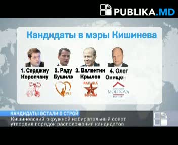 На пост мэра Кишинева баллотируются 13 кандидатов от партий и один независимый кандидат. Таким образом, первым в бюллетене для голосования расположился Серджиу Коропчану, кандидат Социал-демократической партии. За ним следует ставленник христианских демократов Раду Бушилэ, кандидат Партии социалистов Партия - Родина Валентин Крылов, и Олег Онищенко - от партии "Наш дом - Молдова". Кандидат ПКРМ Игорь Додон находится на пятом месте в бюллетене.