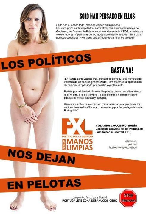 Иоланда Коусейро Морин, которая баллотируется на пост мэра городка Португалете в провинции Бискайя Страны Басков, прибегла к неожиданному методу агитации. Ее штаб разместил на улицах города плакаты с изображением обнаженной Морин. Правда, ее бюст прикрыт частью надписи «Политики оставили нас голыми».