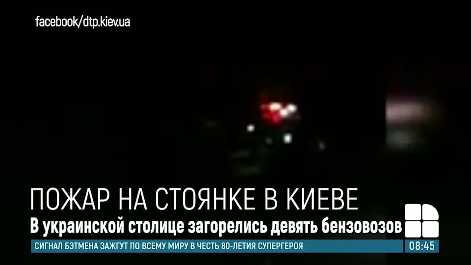 Крупный пожар вспыхнул на одной из стоянок украинского Киева. Загорелись девять бензовозов. Пострадавших нет. По словам очевидцев, на стоянке были слышны взрывы.