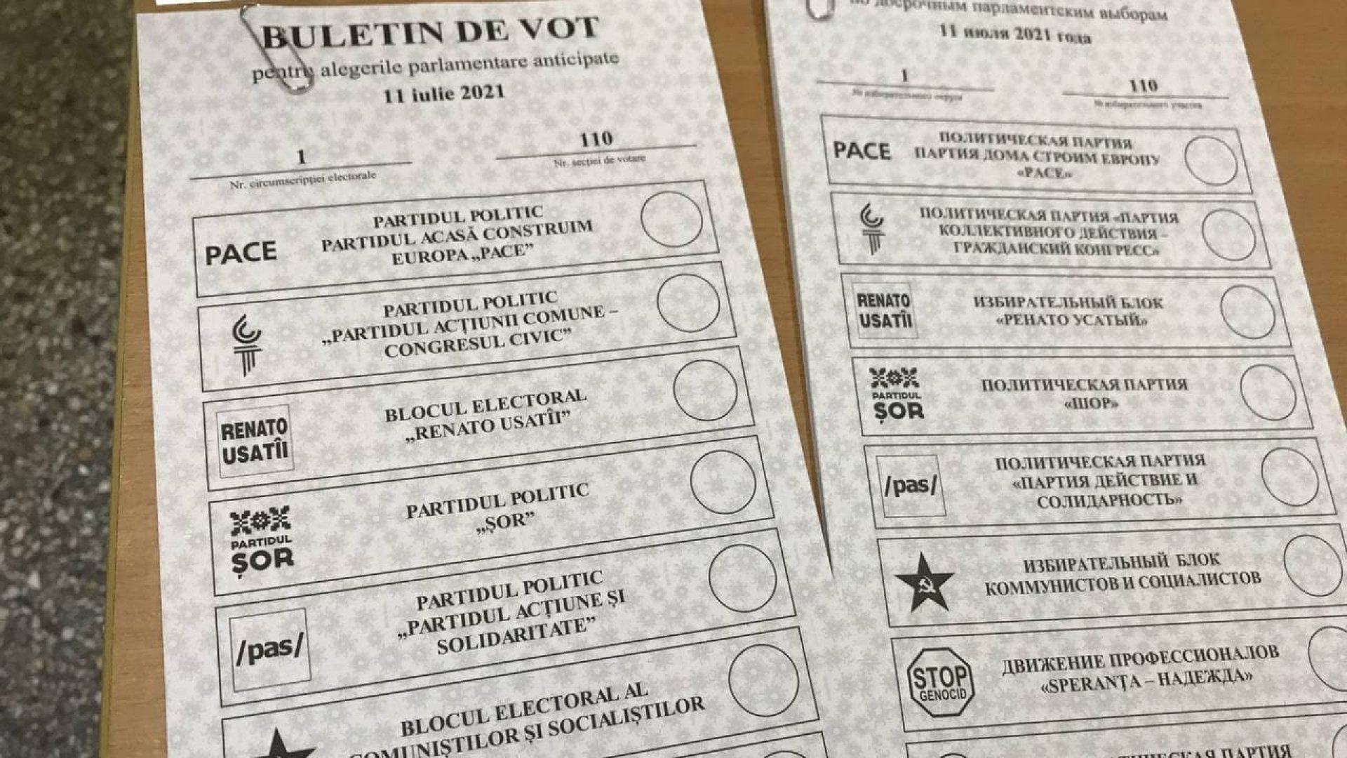 Первую строчку в бюллетене занимает формирование "Дома строим Европу", за ним следует партия коллективного действия - "Гражданский конгресс", избирательный блок "РЕНАТО УСАТЫЙ", партия Шора и ПДС.